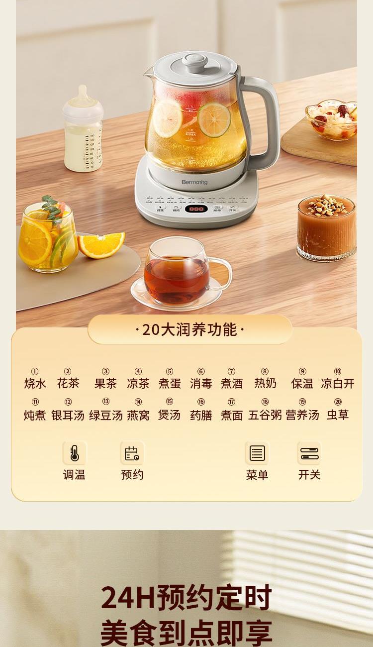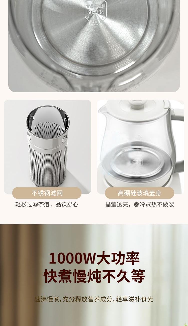 功 率:1000W 容 量:1700ML 材 質:高硼硅玻璃 凈 重:1.3kg 毛 重:1.7kg 操作模式:按鍵版 1000W大功率 熱力強勁,煮得快,美味不等待 1.7L黃金容量 容量剛剛好,養生自在,全家暢飲無壓力 20大潤養功能,一味一程序,道道都專業 304不銹鋼發熱盤,食品級材質,安心每一口 智能變頻溫控,火候自動適配 NTC靈敏溫控 實時測溫,防干燒,防糊底,防溢鍋,安全加倍 24H長效預約,美味準時赴約,無需苦等。