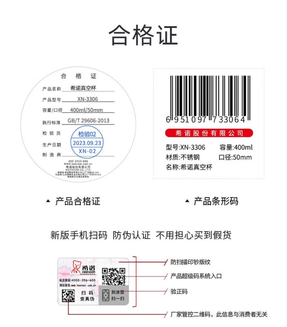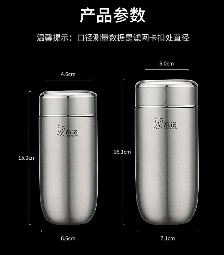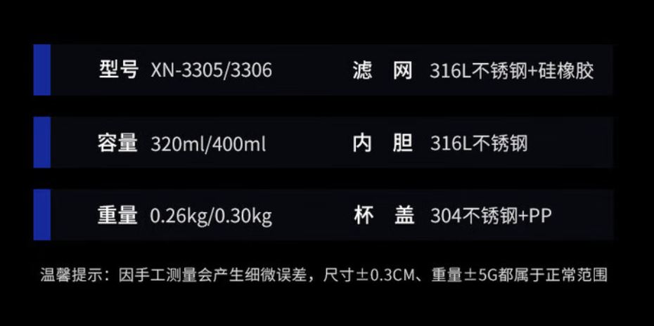 容量 XN-3305 320ML XN-3306 400ML 規格(mm) XN-3305: 46 (杯口直徑)x66(直徑)x150(高度) XN-3306: 50(杯口直徑)x71(直徑)x16.1(高度) 杯體 316不銹鋼 杯蓋 進口食品級PP、316不銹鋼 密封圈 進口食品級硅膠 重量 XN-3305:0.38 kg XN-3306:0.42 kg 顏色 XN-3305:紫羅蘭、清新綠、棕紅、珠光本色 XN-3306:紫羅蘭、棕紅、珠光本色